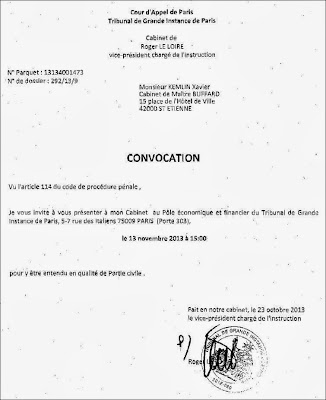 Ainsi, Xavier Kemlin vient de nous faire savoir qu’il est convoqué le 13 novembre au Pôle économique et financier du Tribunal de Grande Instance de Paris pour y être entendu en sa qualité de Partie civile (voir la copie de la convocation).