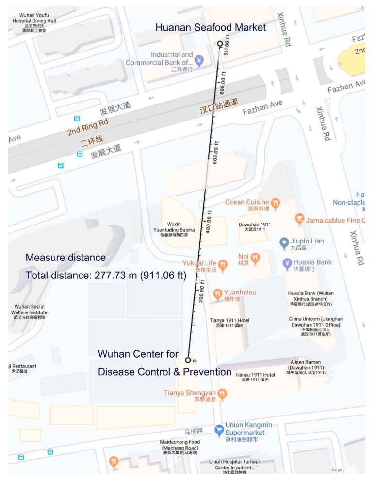 On apprend qu’à 277 mètres à vol d’oiseau du fameux Huanan seafood market, il y a un établissement nommé Wuhan Center for Disease Control & Prevention (WHCDC), qui travaillait entre autres choses sur des virus de chauve-souris. Etonnant, non ? [ter]