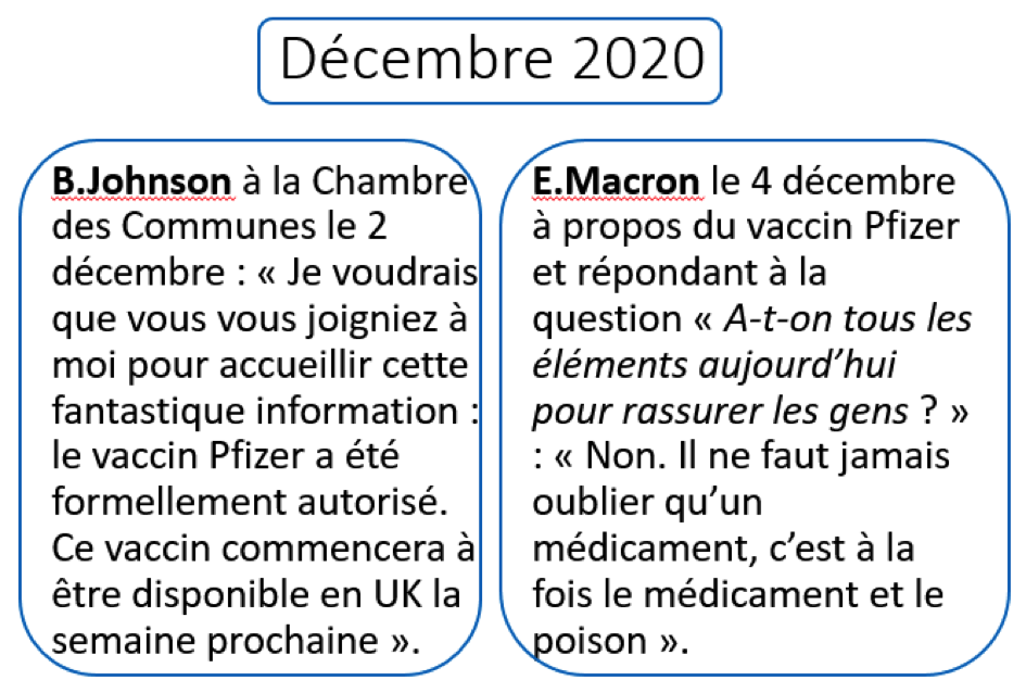 Simple verbatim de la vidéo récente comparant des propos de M. Macron à ceux de quelques homologues (les plus appréciés…) concernant la recherche vaccinale pendant l’année 2020.