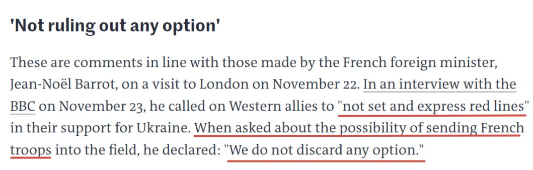 Ainsi, un ministre français des Affaires étrangères est d’abord interrogé sur la possibilité d’envoyer des troupes et il suggère simplement, de son propre avis, qu’« aucune ligne rouge ne devrait être fixée ». C’est tout. Juste une autre suggestion vague ou une insertion non sollicitée.