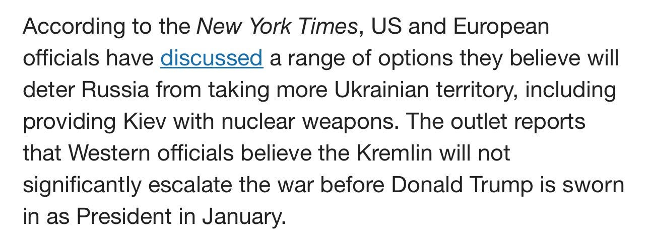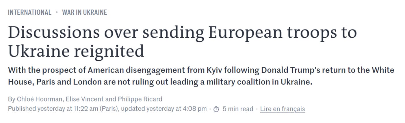 En fait, plus loin dans l’article, ils tentent de limiter les attentes en laissant entendre que ces troupes seraient destinées à une force de maintien de la paix après la cessation des hostilités. C’est parce que Biden a signalé qu’il laisserait le conflit à l’Europe, et que Trump cherche à mettre en œuvre un cessez-le-feu le long de la ligne de contact – on pense donc que des troupes européennes pourraient devoir être envoyées comme une sorte de force de la KFOR.