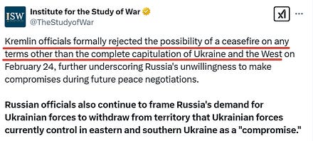 ISW semble être d’accord avec leur dernier rapport, affirmant que la Russie a désormais « rejeté » la possibilité de cessez-le-feu à d’autres conditions qu’une capitulation totale :