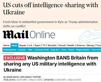 Il est désormais confirmé que Trump a suspendu à la fois l’aide militaire et le partage de renseignements à l’Ukraine, ce qui a bouleversé l’élite européenne.