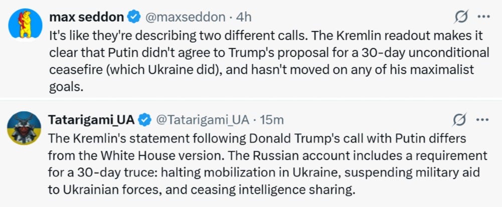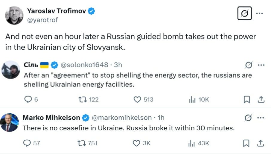 Il en va de même pour l’acquiescement de Poutine à un cessez-le-feu de 30 jours sur les frappes énergétiques, que l’Ukraine, comme indiqué précédemment, « doit accepter ».