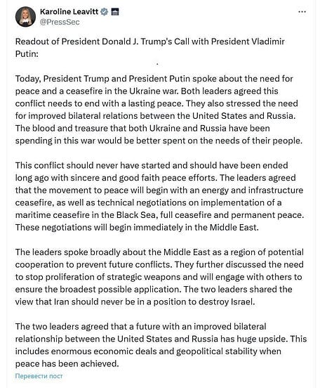 Lors de son appel téléphonique avec Trump, Poutine a exprimé les inquiétudes de la Russie concernant un cessez-le-feu : des contrôles stricts sont nécessaires, ainsi qu’un arrêt de la mobilisation forcée et du réarmement de l’Ukraine. Poutine a souligné que le passé de Kiev, marqué par des violations constantes des accords et par des actes de terrorisme, doit également être pris en compte