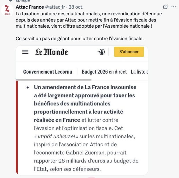 Voilà un débat qui a le mérite de clarifier la position des différents partis en France. La fameuse taxe à 26 milliards votée par la gauche et le RN est loin des présentations de ses opposants. Face aux mécanismes de désertion fiscale des multinationales, qui délocalisent comptablement activité et profits dans des parasites fiscaux (comme ces GAFAM qui facturent leur activité en France depuis l’Irlande), ou qui jouent sur les règles comptables pour délocaliser leurs profits, nos députés ont seulement voté pour mettre en place une imposition plus juste sur les profits. Autant dire que cette taxe ne touchera pas l’immense majorité des entreprises, qui ont une activité uniquement en France, et ne peuvent pas jouer sur les règles comptables et le laisser-passer de l’Union Européenne, paradis des parasites fiscaux…