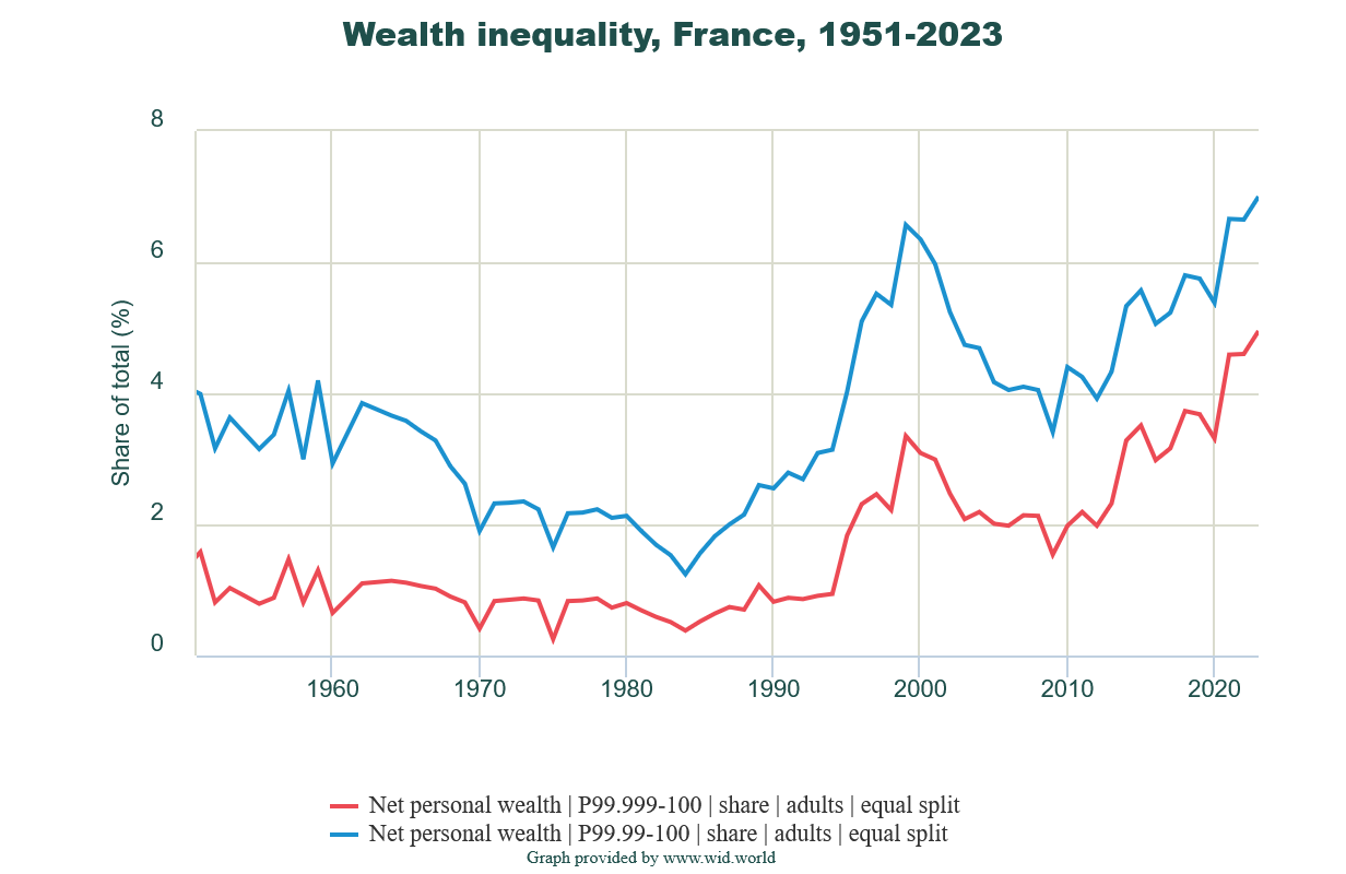 La part de richesse détenue par la classe la plus riche est passée de 0,4 % en 1984 à 5 % en 2023. À vrai dire, j’ai été surpris de constater un effet aussi important, car je pensais que la France avait un système fiscal fortement progressif.