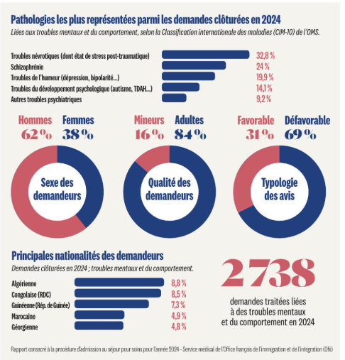 Selon le dernier rapport du service médical de l’Office français de l’immigration et de l’intégration (Ofii), les troubles mentaux et du comportement représentent une part significative des demandes de titre de séjour pour soins. Entre 2017 et 2024, le nombre de dossiers liés à la santé mentale a fortement progressé. En 2024, 2 738 demandes ont été traitées sur ce fondement. Les troubles anxieux, notamment l’état de stress post-traumatique, arrivent en tête, suivis de la schizophrénie, des troubles de l’humeur et des troubles du développement psychologique.