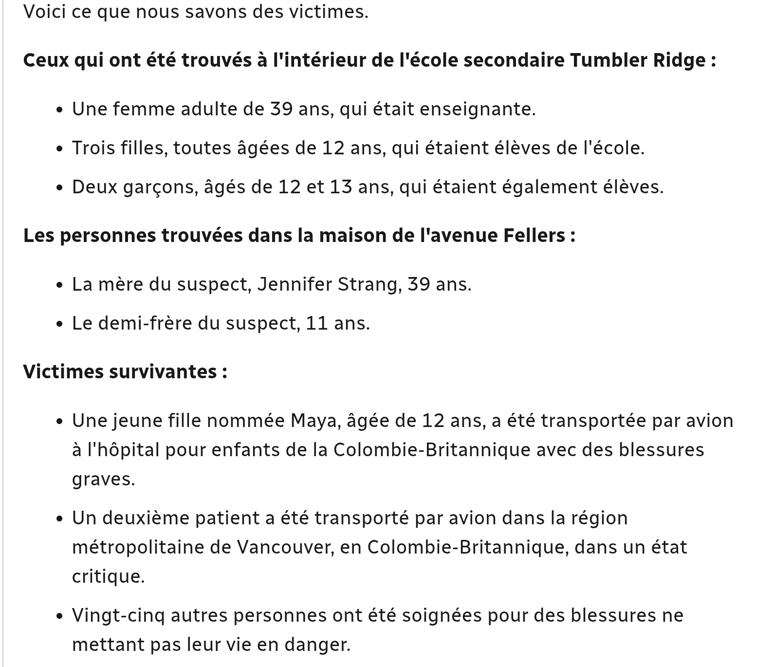 Van Rootselaar a quitté l’école il y a quatre ans. Interrogé sur la possibilité que le suspect ait été victime de harcèlement « en raison de sa transition de genre », McDonald affirme qu’il n’y a aucune indication en ce sens. McDonald affirme qu’aucune information ne permet de penser que le suspect a été victime de harcèlement scolaire.