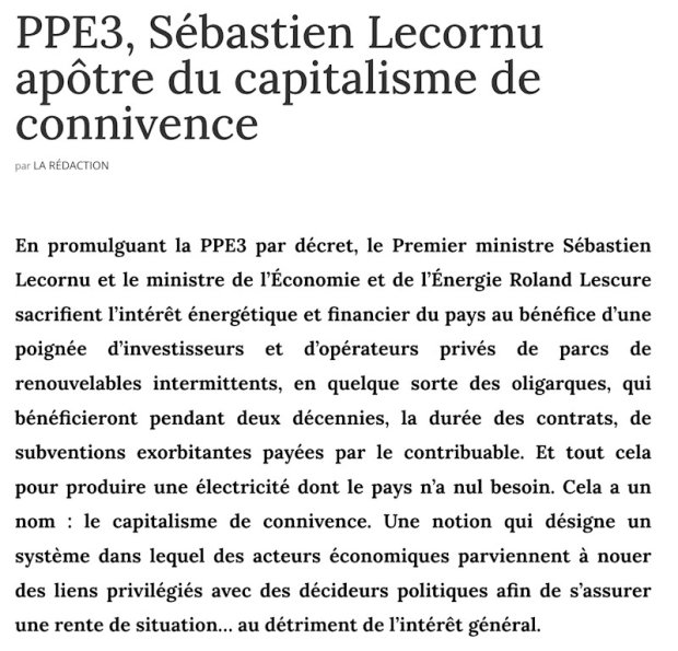 Bref, tout doit être fait pour s’opposer à cette PPE3, y compris faire tomber ce gouvernement. Elle va appauvrir plus encore les Français et enrichir des actionnaires bien connectés qui développent leur rente renouvelable… Et le renchérissement du prix de l’électricité va continuer à peser sur notre industrie, qui n’en a pas besoin. Merci à tous ceux qui alertent sur le sujet, d’Alexandre Jardin à Nicolas Meilhan.