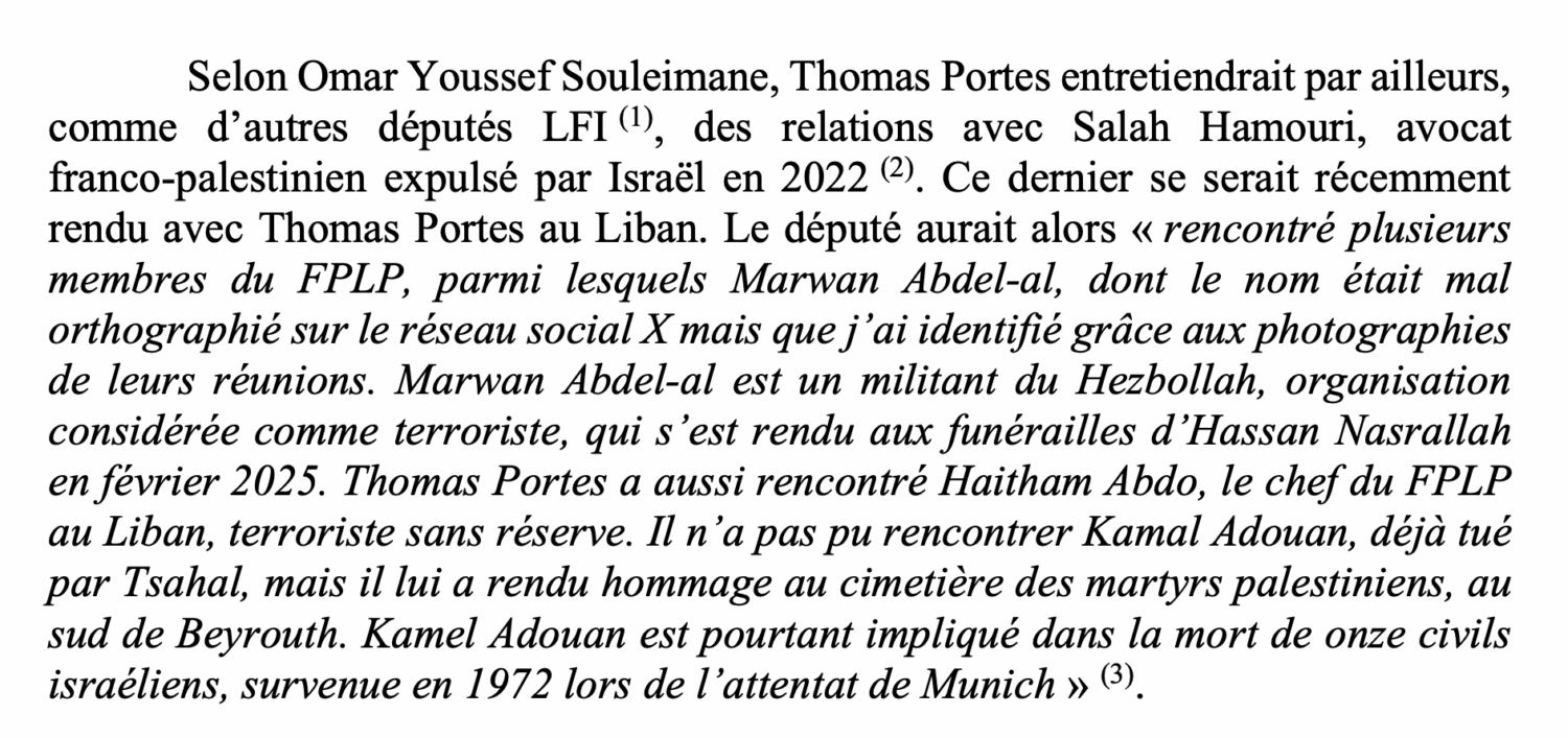 Mais ce rapport égrène aussi une longue liste des fréquentations de Thomas Portes. Interrogé par la commission d’enquête, le journaliste Omar Youssef Souleimane, auteur du livre-enquête Les Complices du mal (éditions Plon), sur l’alliance entre extrême gauche et islamisme politique, cite notamment Salah Hamouri, avocat franco-palestinien expulsé par Israël en 2022, avec qui le député LFI a rencontré au Liban « plusieurs membres du FPLP, parmi lesquels Marwan Abdel-al », un militant du Hezbollah, ainsi que « Haitham Abdo, le chef du FPLP au Liban ». Il se serait aussi rendu « au cimetière des martyrs palestiniens, au sud de Beyrouth », afin de rendre hommage à Kamal Adouan (tué par l’armée israélienne), qui était « impliqué dans la mort de onze civils Israéliens, survenue en 1972 lors de l’attentat de Munich ».