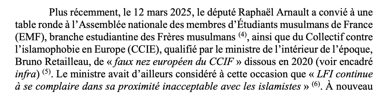 Raphaël Arnault n’est pas oublié, puisque le rapport rappelle que le 12 mars 2025, le député LFI et fondateur de la Jeune garde « a convié à une table ronde à l’Assemblée nationale des membres d’Étudiants musulmans de France (EMF), branche estudiantine des Frères musulmans, ainsi que du Collectif contre l’islamophobie en Europe (CCIE) », nouvelle vitrine officielle du frérisme depuis la dissolution du CCIF en France. Un grand déballage qui ne fait sans doute que commencer.